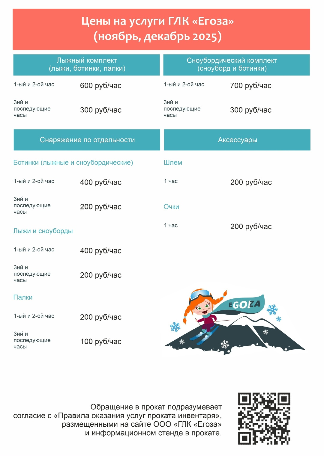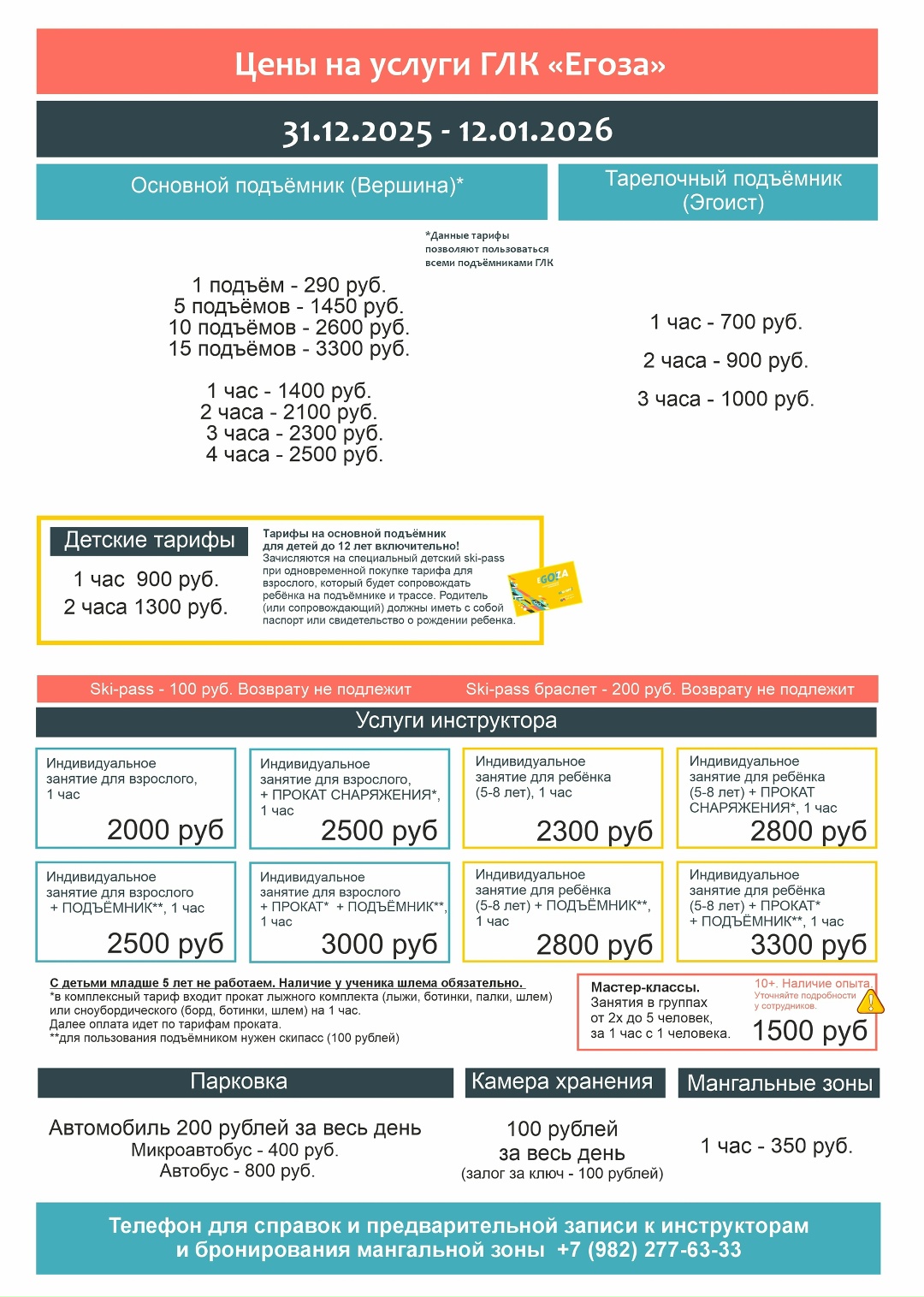 Режим работы ГЛК «Егоза»: 29, 30 декабря (пн, вт) – выходные дни. 31 декабря – с 10:00 до 17:00. 1 января – с 12:00 до 17:00. Со 2 по 11 января – ежедневно с 10:00 до 17:00.