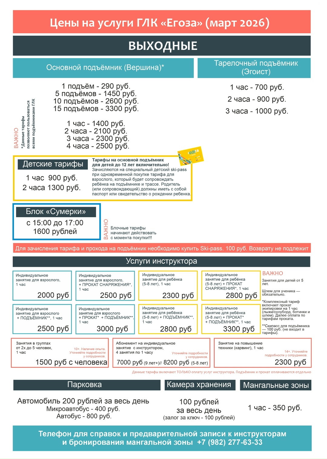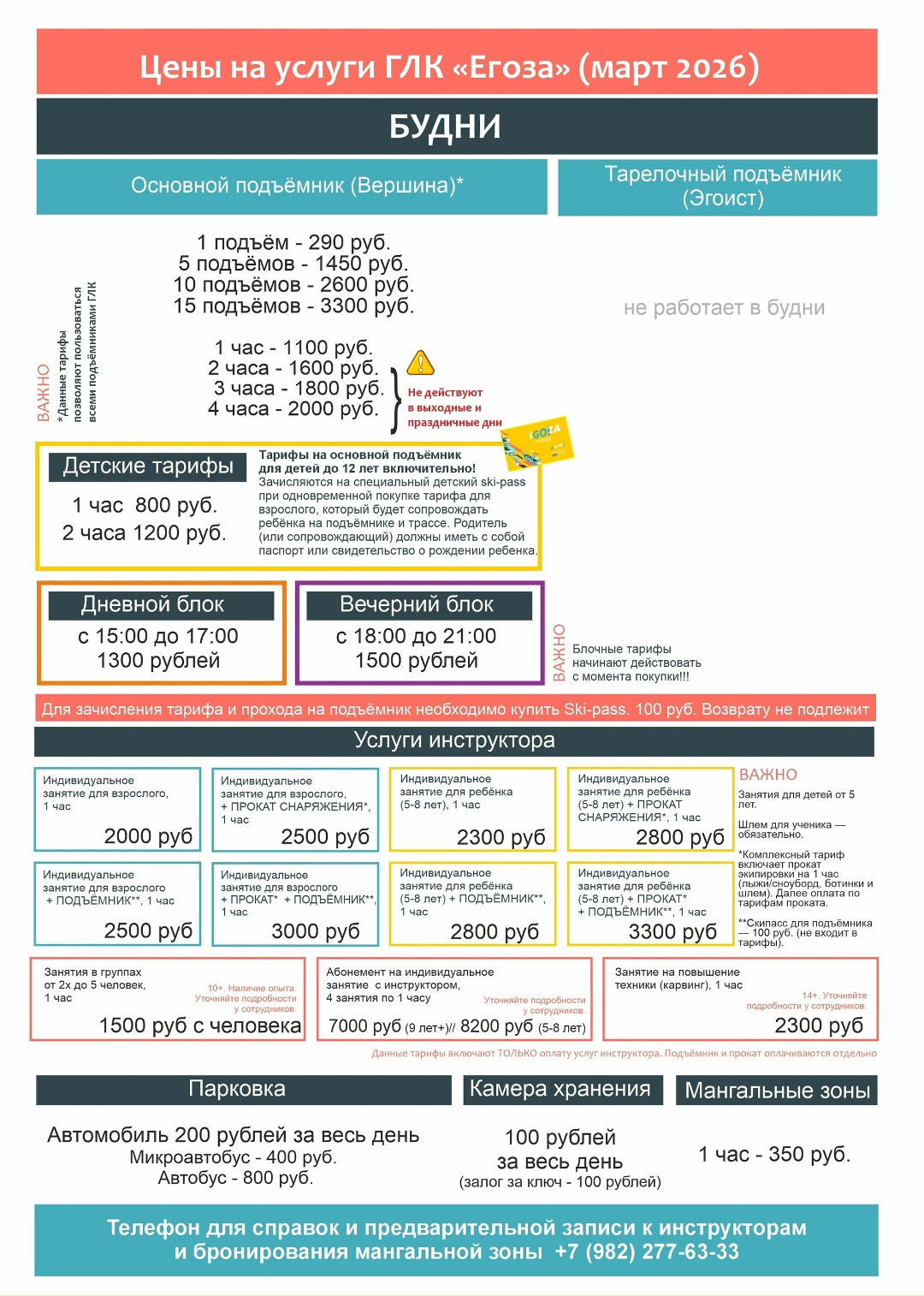 В данный момент ГЛК «Егоза» закрыт. Идет подготовка к летнему сезону.